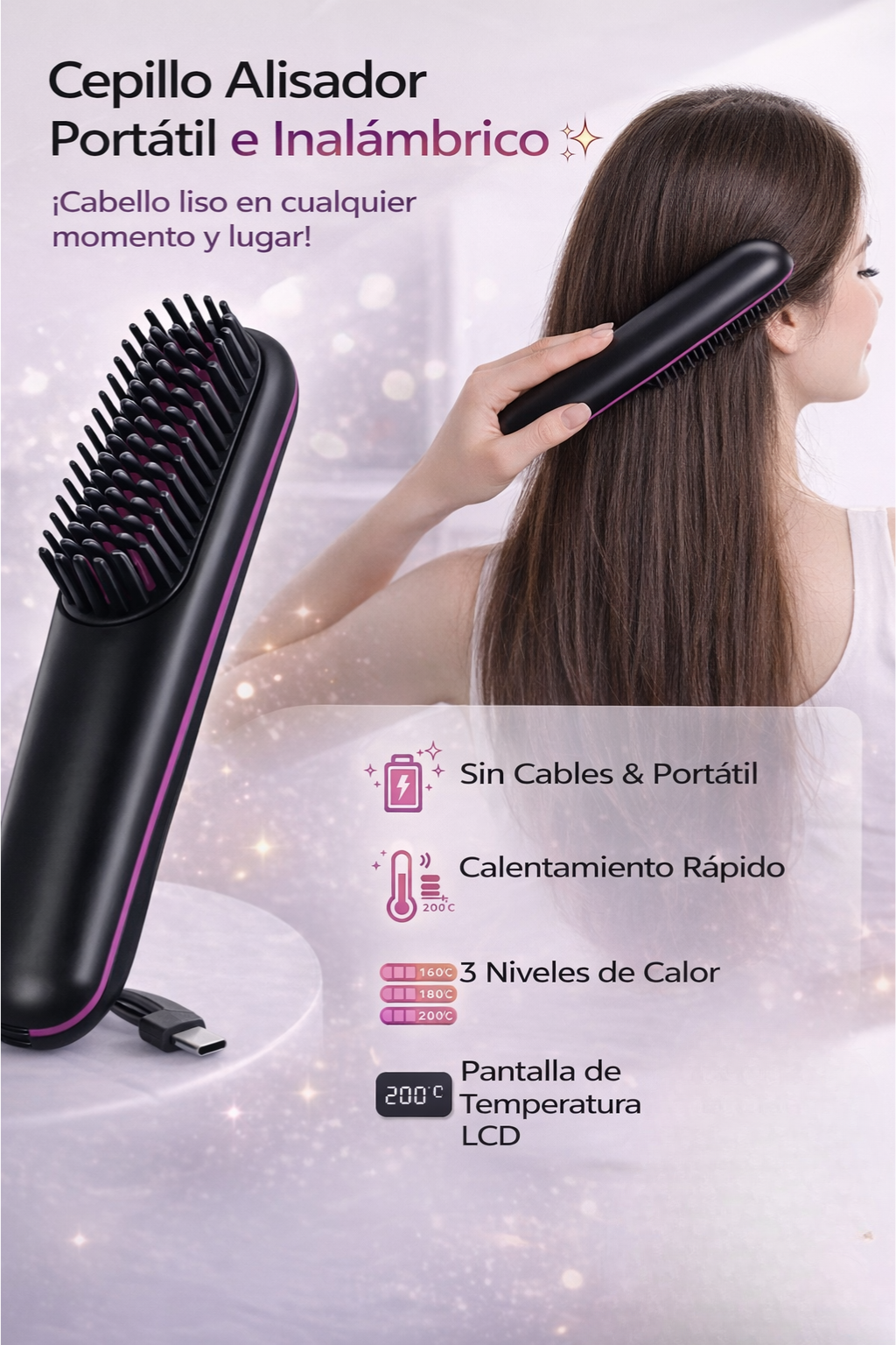 Logra un acabado suave, brillante y sin frizz desde cualquier lugar ✨ Su diseño inalámbrico y ligero, junto con el control inteligente de temperatura, se adapta a tu tipo de cabello para resultados rápidos y seguros, ideales para viajes, oficina o uso diario.
